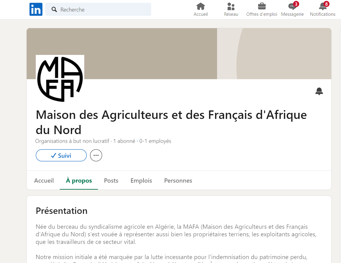 Nous sommes heureux de vous annoncer la création officielle de la page LinkedIn de la Maison des Agriculteurs et des Français d'Afrique du Nord (MAFA). Cette nouvelle étape s'inscrit dans notre mission de longue date : défendre les intérêts des agriculteurs et des communautés françaises d'Afrique du Nord, tout en mettant en lumière les tragédies et les disparus de l'Algérie.